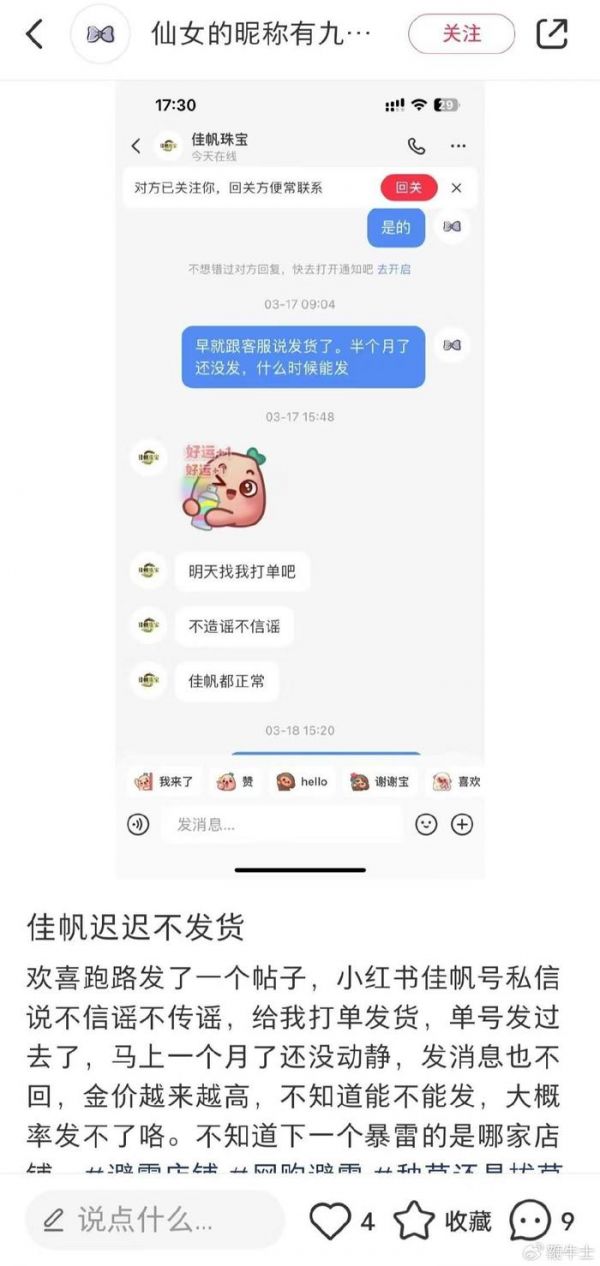 鞭牛士 4月14日消息,鞭牛士发现,近期随着金价大幅上涨,多家购物平台的黄金饰品不发货以及出现虚假物流信息等遭到多名消费者的投诉和吐槽,涉及的平台有得物、淘宝、京东等。