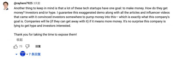 rayhere7925认为:许多这样的科技初创企业只有一个目标:赚钱。他们如何获得资金?通过投资者和/或炒作。我敢肯定,这种夸张的演示以及随之而来的所有文章和影响者视频,一定说服了某些地方的投资者向这家公司注资——这正是这家公司的目标。如果这意味着可以赚更多的钱,公司会撒谎(如果他们能侥幸成功的话)。这家公司为了炒作和吸引投资者而撒谎也就不足为奇了。