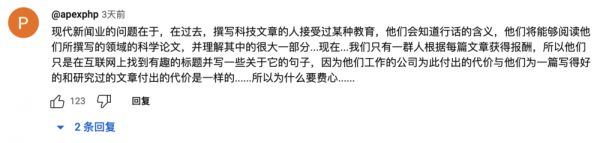 Apexphp则认为:现代新闻业的问题在于,过去撰写技术文章的人通常对该领域有一定的了解,他们知道专业术语的含义,能够阅读自己写作领域的科学论文,并理解其中的大部分内容。但现在,我们只有一群按篇酬付费的人,他们在互联网上找到有趣的标题,然后简单写几句话,因为他们所在的公司支付的费用与他们为一篇撰写精良、经过深入研究的文章支付的费用相同,所以他们也就没必要多费心了。