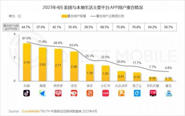 之所以这么做,是因为美团与抖音重合度太高。据第三方机构 QuestMobile 发布的《2023 年本地生活服务行业洞察》显示,抖音与美团重合用户规模超 3 亿,重合用户占美团总体用户的 81%。