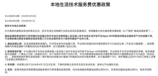 此外,在技术服务费方面,快手只收取 1-2% 的费率外,在 2023 年 7 月开始按照 60% 的比例向符合标准的商家返还技术服务费,2024 年 4 月 1 日起返还比例下降到了 10%。