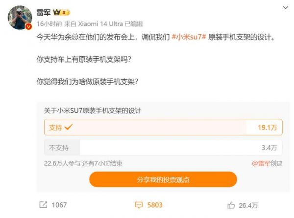 碰巧小米SU7发布会中的一个小高潮就是展示官方手机支架配件的环节,雷军也将其视为重要的产品卖点,所以余承东在台上的暗讽对象不言自明。随后雷军在微博上发起投票,询问网友对待车载手机支架、预装安装孔位等功能的看法,截至4月12日上午已有22.6万人投票,不出意外地“支持”选项占到了绝大多数。
