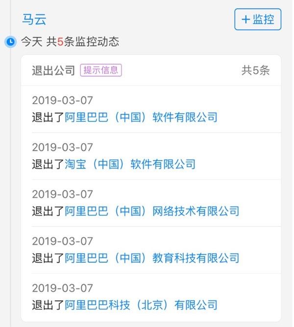 IT之家3月8日消息 据天眼查信息显示,3月7日,马云已经退出了阿里旗下5家公司,包括阿里巴巴(中国)软件有限公司、淘宝(中国)软件有限公司、阿里巴巴(中国)网络技术有限公司、阿里巴巴(中国)教育科技有限公司、阿里巴巴科技(北京)有限公司。