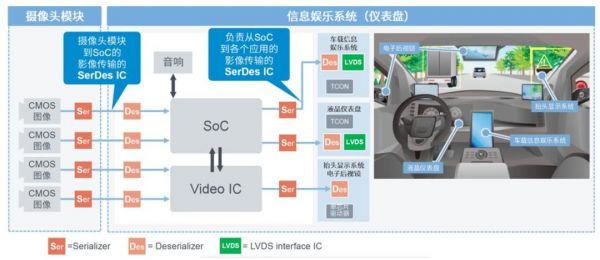在汽车中,SerDes用于车载摄像头到ADAS域控制器、或座舱域控制器到车载显示屏幕的长距离、实时数据传输。