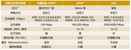 中国的车载高速媒体传输标准HSMT在技术规范要求上,优于已有国外公司的企业私标,与其它类似的国外竞品标准(APHY/ASA)对比优势也非常明显。中国HSMT标准与其他两个国外标准的技术对比如下表所示。