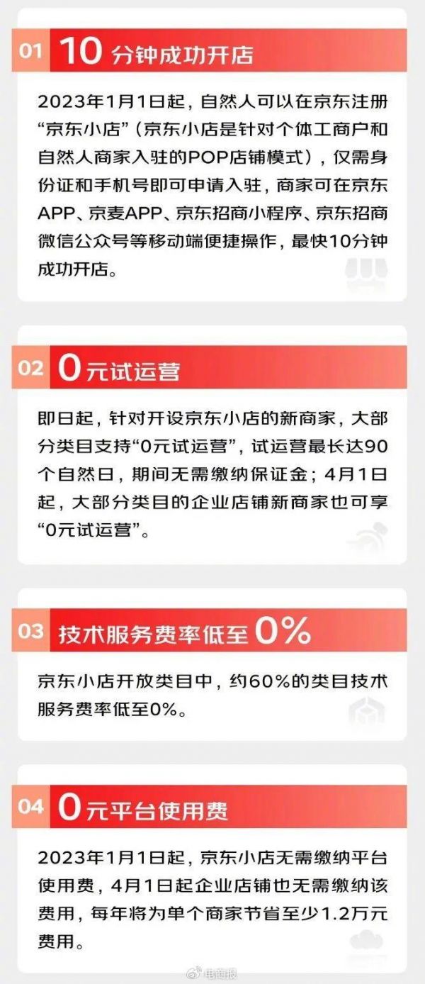 2023年1月,京东发布“春晓计划”,为自然人提供快速入驻通道、“0元试运营”、2100元“新店大礼包"等12项扶持政策,大量个人卖家开始涌入京东。
