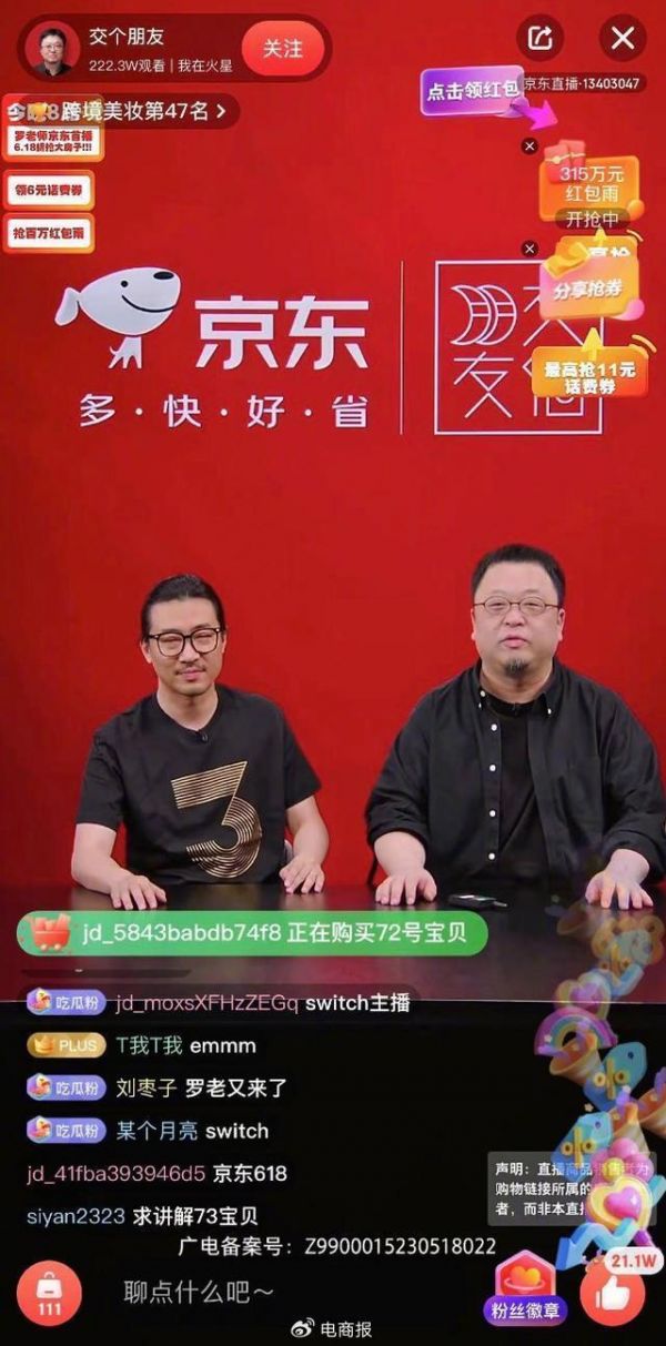 直播方面,去年618罗永浩来到京东开启直播带货,销售数码3C、家电、酒饮等类目的产品,累计销售额突破1.5亿元,观看人次超过1700万。值得一提的是,2022年的双11罗永浩已经“入淘”,不久前也曾在淘宝为阿里云带货