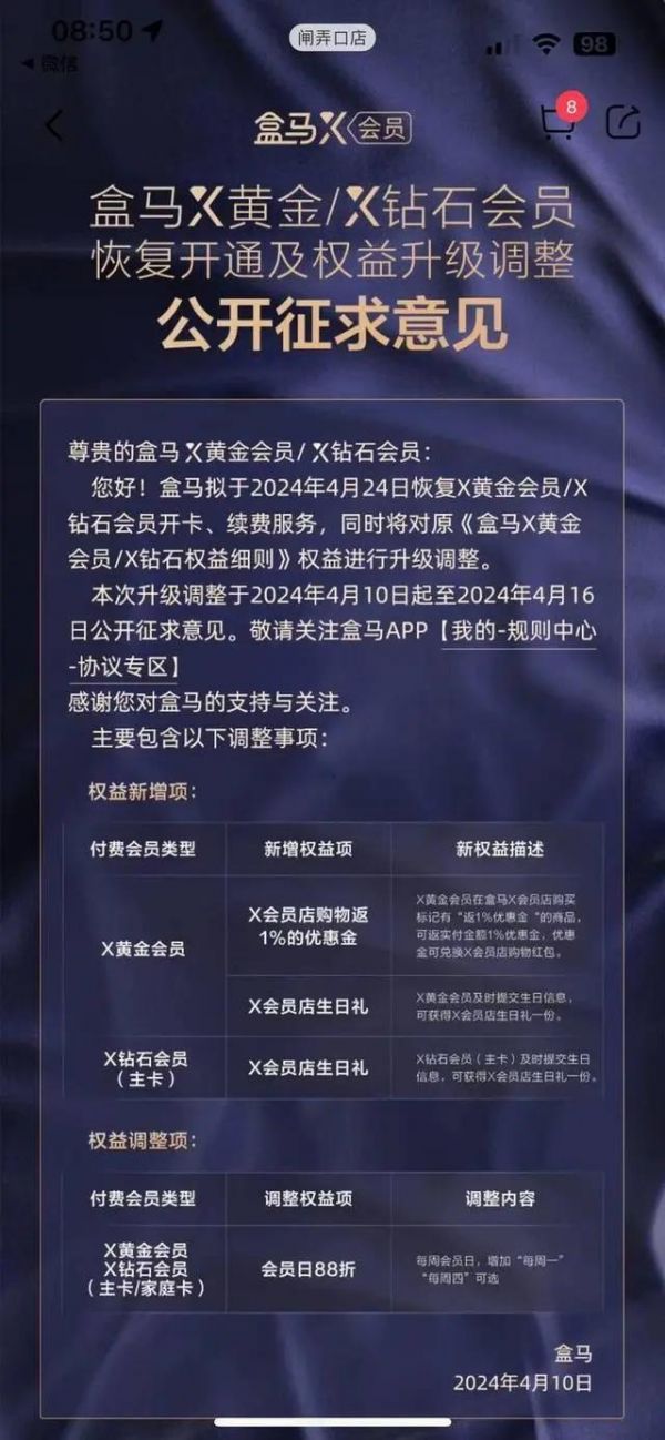 4月10日,盒马发布一份公开征求意见的公告称,拟于2024年4月24日恢复X黄金会员、X钻石会员的开卡及续费服务,原盒马X会员店VIP将升级为盒马X黄金会员,并且对原会员权益进行了调整。