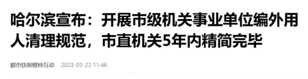 其中,力度最猛的当属哈尔滨,要求每年精简20%相关编外人员,市直机关5年内精简完毕。
