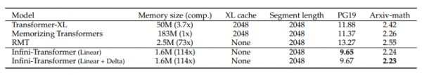 采用无限注意力的模型在PG19(长文档数据集)以Arxiv-math(数学数据集)上都取得了远超于transformer-XL的结果,同时实现了114倍的内存压缩率,在保持低困惑度的同时提高了模型效率。