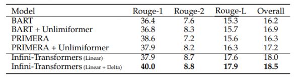 根据无限注意力在50万文本长度的图书中里生成的摘要,模型超越了专门为摘要任务构建的编码器-解码器模型及其长上下文扩展版本,实现了在BookSum数据集上的新SOTA(state-of-the-art)性能。随着输入书籍文本量的增加,模型的摘要性能指标(如Rouge分数)呈现出明显的上升趋势。
