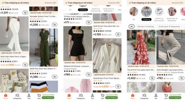 点开 Shopee 菲律宾站的女装区(women's apparel),到处都是一比索包邮的衣服,不参与活动的同品类商品,单价最高也很难超过120比索(2美元出头);TEMU 同品类的单价则大概在160-200比索的区间,相比之下完全没优势。