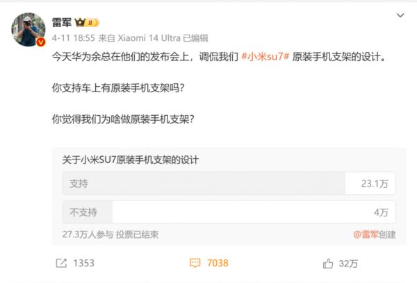 同日,雷军在微博发文称,“今天华为余总在他们的发布会上,调侃我们小米SU7原装手机支架的设计。”他同时发起微博投票,“你支持车上有原装手机支架吗?你觉得我们为啥做原装手机支架?”