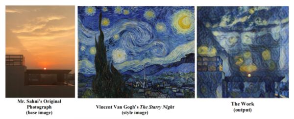 申请者Ankit Sahni在向版权局提交的创作过程说明中表示:他拍摄了AI生成图像所参照的底稿(the “base image”),指示AI以梵高的《星夜》为图像的风格参照(the “style image”),并手动选定了风格强度变量。在考虑谁为作者时,Ankit Sahni认为他与AI对生成图像的贡献是互不相同、各自独立的,因此申请与AI共同作为合作作者。