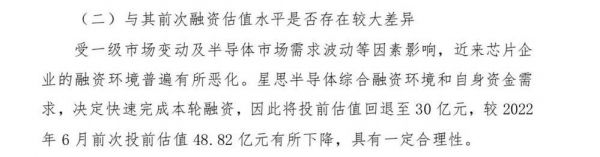 但是,从本次投资方蓝盾光电对深交所关注函的回复公告中,我们注意到令人意外的一幕——星思半导体投前估值30亿元,较此前48.82亿元的投前估值,下降至60%多。