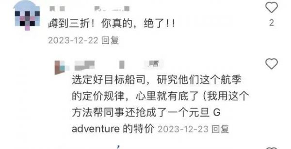 有不少网友在社交平台上纷纷分享抢票小妙招:盯好目标船司,研究航季的定价规律,定期查看官网网页,4折不要急,只要还有时间也许就还有3折。