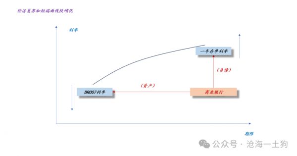 如果把商业银行的资产端和负债端囊括在一块,就有了上图。于是,对商业银行来说,经济越好,一年存单利率越高,DR007利率越低。