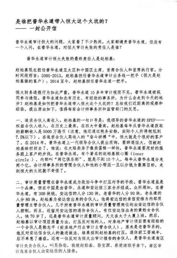 图源:普华永道微信公众号截图4月13日,一封题为《是谁把普华永道带入恒大这个火坑?》的公开信开始流传。公开信矛头直指普华永道亚太及中国区主席赵柏基,称赵在公司内部有“赵柏基核心圈",不到10个人的小团队,每年分走2亿元人民币。