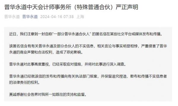 4月16日,普华永道发布声明称,近日注意到一封自称“一部分普华永道合伙人”的匿名信在某些社交平台或媒体发布和传播。