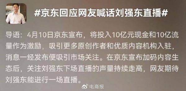 近日,京东官宣10亿元现金和10亿流量,加码内容生态。此消息一出,网友们纷纷喊话刘强东下场直播。