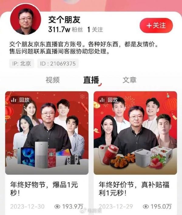 目前在京东平台上搜索交个朋友直播间,可以看到该直播间粉丝量达到300多万,但最新的一次直播回放时间为2023年12月30日,观看人数接近200万。今年以来,交个朋友京东直播间仍没有新的直播动向。