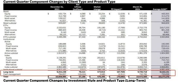 据贝莱德集团今年一季度季报,其资产管理规模突破历史记录达10.5万亿美元,较去年一季度大增约1.4万亿美元,增幅高达15%。值得关注的是,贝莱德一季度资金净流入达764亿美元,占去年全年净流入的40%,其中670亿美元流入贝莱德旗下ETF。