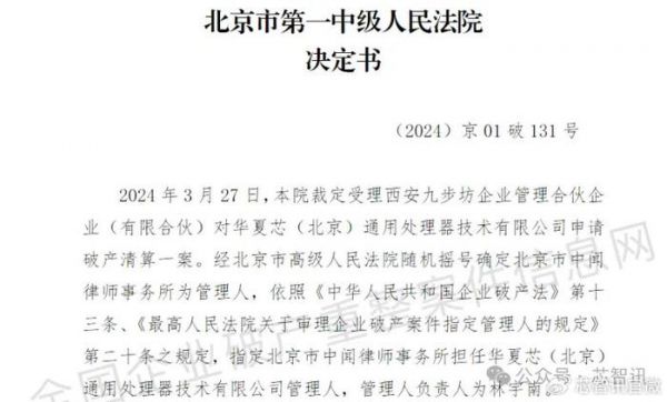 4月15日,根据全国企业破产重整案件信息网披露的信息显示,北京市第一中级人民法院作出(2024)京01破申97号民事裁定书,裁定受理西安九步坊企业管理合伙企业(有限合伙)对华夏芯(北京)通用处理器技术有限公司(以下简称“华夏芯”)申请破产清算一案。经北京市高级人民法院随机摇号确定北京市中闻律师事务所为华夏芯管理人。