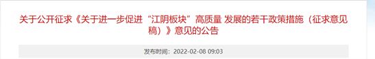 2022年江阴政府推出了关于公开征求《关于进一步促进“江阴板块”高质量 发展的若干政策措施(征求意见稿)》意见的公告,指出为进一步深化金融供给侧结构性改革,着力打造以先进制造业为底色,战略性新兴产业为特色的“江阴板块”,助力构建现代化产业体系建设,江阴市工业和信息化局组织起草了《关于进一步促进“江阴板块”高质量发展的若干政策措施(征求意见稿)》