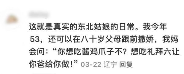 有人说东北爸妈之所以会宠爱女儿,首先是因为自己活得通透,“他们吃过工厂的大锅饭,也经历过下海创业的时代。他们知道外面的世界值得闯荡,也认同东北的黑土地呆着也挺养人,他们自己不拧巴,所以就不会把焦虑投射在下一代身上。”