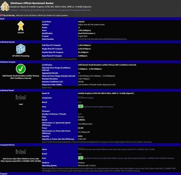 在著名的综合测试软件SiSoftware Sandra的数据库中,我们发现了两款不同型号的Arrow Lake处理器,他们的差距主要是GPU的规格,其中一款GPU采用的是8个Xe架构,相当于128个EU,L2缓存为8MB,而另外一款则是4个Xe架构,相当于64个EU,L2缓存为4MB,此外在频率上,这两款GPU均为2.0GHz。