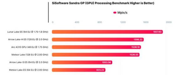 至于具体性能,8个Xe架构的Arrow Lake处理器每秒填充1598百万像素,似乎与锐龙8000系APU相差不大,而4个Xe架构的Arrow Lake处理器则每秒填充1053.56百万像素,与之做对比的是,128个EU的Meteor Lake处理器每秒填充1526.55百万像素,而64个EU的Meteor Lake处理器每秒填充923.22百万像素,应该来说Arrow Lake处理器与Meteor Lake处理器在图形性能上并没有太大的变化,毕竟大家用的架构和频率都一样。至于Lunar Lake由于采用了更新的架构,因此像素填充性能更加出色,64个EU的版本填充率达到了1927百万像素。