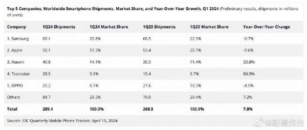 2023第三季度全球手机市场份额出炉,小米第三,vivo掉出前五
