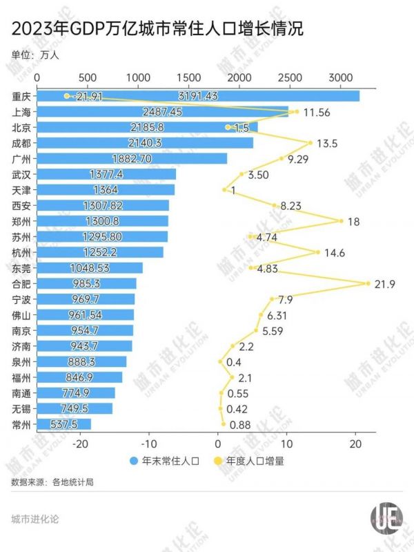GDP万亿城市是全国经济发展的排头兵,也是人口增长的主力军。