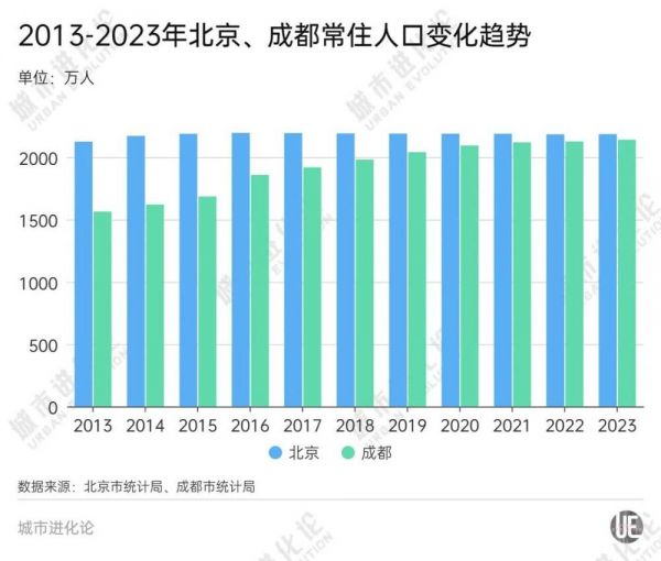 2023年,成都常住人口达到2140.3万人,比上年增长13.5万人,增量居全国前列。同年北京常住人口为2185.8万人,比上年增加1.5万人,一举扭转“六连跌”的下行趋势。