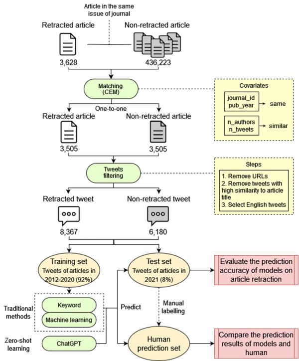 最近,来自中国人民大学和浙江大学等机构的研究者把涉及数千篇SCI/SSCI的期刊论文的一万多条推文喂给了GPT-4,让它根据推文回答这篇论文是否有可能被撤稿,然后和人类预测的结果相比较。