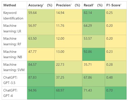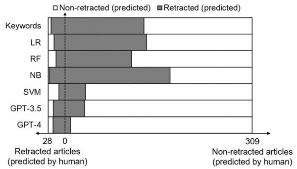 既然发现推文具有预测论文撤稿的潜力,研究进一步探索了关键词方法、机器学习模型和ChatGPT在根据推文来预测论文撤稿方面的潜力,将各模型的预测结果与人工预测结果进行比较。