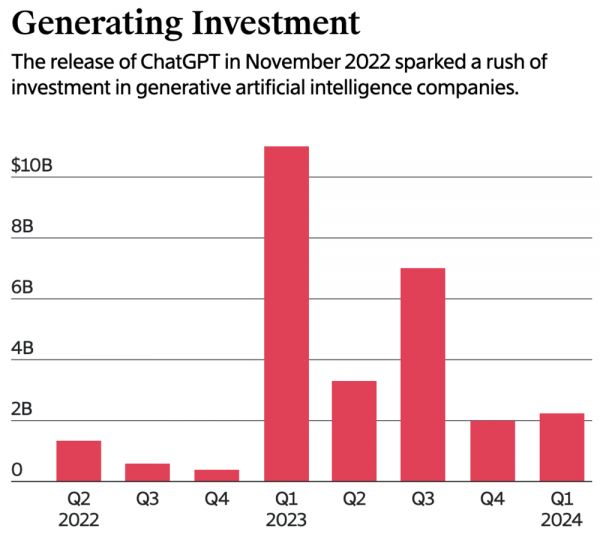 当然,一些 AI 企业继续吸引大量资金,例如亚马逊最近对 Anthropic 的数十亿美元投资,以及微软以 6.5 亿美元“收购”Inflection AI 的顶尖人才(如果不是买下这家公司本身)。