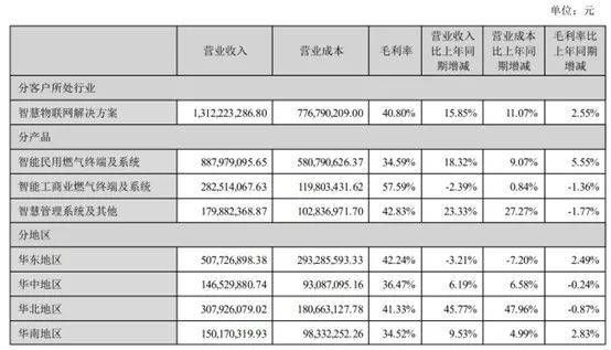 气表公司金卡智能2023年半年报显示,智能民用燃气终端及系统为其营收最多的产品,营收为8.87亿元,同比增长18.32%。华东地区为销售最多地区,销售收入为5.07亿元,未展示西南地区销售情况。