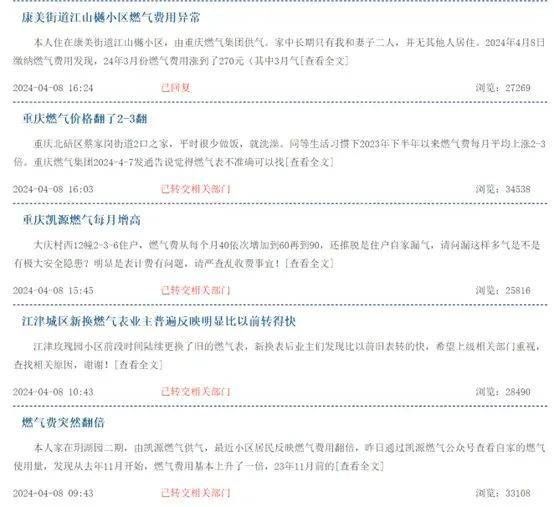 重庆经信委副主任涂兴永表示,截至4月12日,共受理咨询和投诉7362件,目前正在有序核对和处理之中。同时,还督促重庆燃气集团等企业开展自查自纠,目前已完成20多万户用户筛查,对用户用量增幅较大的,通过线上沟通、上门核查等方式,逐一进行复核,并及时解决。