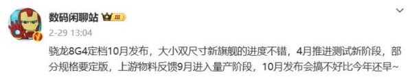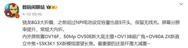 数码博主@数码闲聊站 今日的一份爆料中提到:“骁龙8G4新机本月进入下一内测阶段,值得关注的点是新型潜望镜和超声波指纹是否顺利通关。1.5K/2K双尺寸策略是不变的,这代全系会上新一代硅材料高密度电芯,主摄依旧是豪威定制超大底50Mp方案,新技术完全体~”
