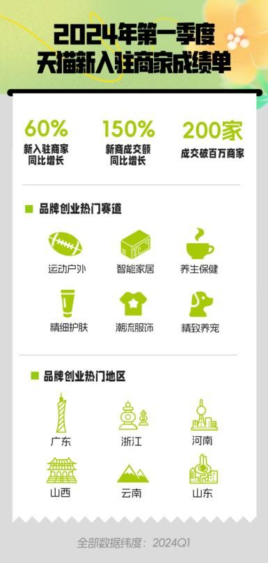 格隆汇4月16日|天猫今日公布2024年第一季开店数据:新入驻商家同比增长60%,全球大牌、新锐品牌加速入驻天猫。其中,运动户外、智能家居、养生保健、精致养宠、潮流服饰、精细护肤等成为今年热门赛道,新商数量同比增长100%。天猫作为品牌经营和商家创牌的首选阵地,第一季度新入驻商家中涌现出大量“尖子生”,新商成交额同比去年增长150%,开店三个月内,销售破百万的新商家超过200家。一季度天猫开店情况分地域来看,广东、浙江、河南、山西、云南、山东成为新入驻商家热门地区。除了传统的江浙沪和珠三角两大“包邮区”继续领跑之外,山西、云南、山东等省份品牌创新创业活力显现,跻身“八强”。