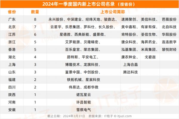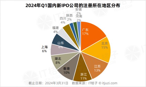 2024 年 Q1 新增的国内 IPO 企业中,注册在广东的企业最多,有 8 家,占比 17%。包括位于广州的化妆品制造商“芭薇股份”,位于东莞的变压器生产商“美信科技”,位于珠海的移动运营商软件和技术服务提供商“经纬天地”。