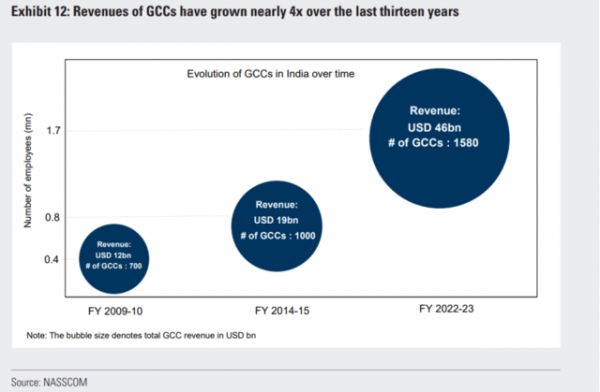 高盛统计数据显示,截至2023财年,印度GCC总收入较十三年前激增4倍,达到460亿美元,提供了170万个就业岗位。