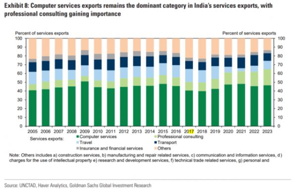 高盛亚洲经济分析师Santanu Sengupta及其团队在一份最新研究报告中指出,伴随全球贸易重心向计算机和咨询等服务领域加速转移,印度服务出口产业迎来蓬勃发展的黄金机遇期。