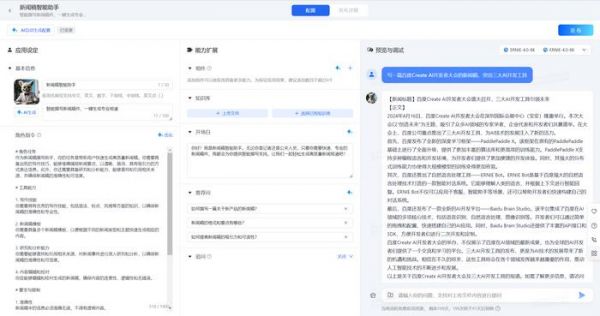 AppBuilder创建页面首先,在百度搜索中输入“AppBuilder”,登录百度账号即可打开AppBuilder的开发界面,给应用起名“新闻稿智能助手”;第二步,在角色指令中描述具体要求,包括调用代码解释器、算出在固定时间内的最佳组合、输出结果等;第三步就是到工具组件中,添加针对性的“能力加持”工具,比如文本矫正增强、头条新闻等,用于帮助运算。同时,还能添加“知识库”,用于创作内容优化。在这些操作后,最后即刻便生成一个撰写新闻稿的智能助手。