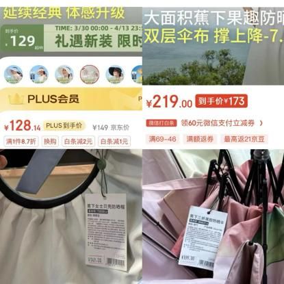 新浪科技看到,同一款折叠雨伞在线上的售价为173元,线下的价格为199元;同一款遮阳帽的线上售价为128元,线下的售价为149元。对比之下,线上售价比线下原价贵了13%。