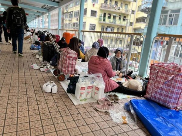 再往前走,经过旺角一带比较大的一座过街天桥,我发现,通道两侧全被铺上地垫,坐满了聚会休息的菲佣。