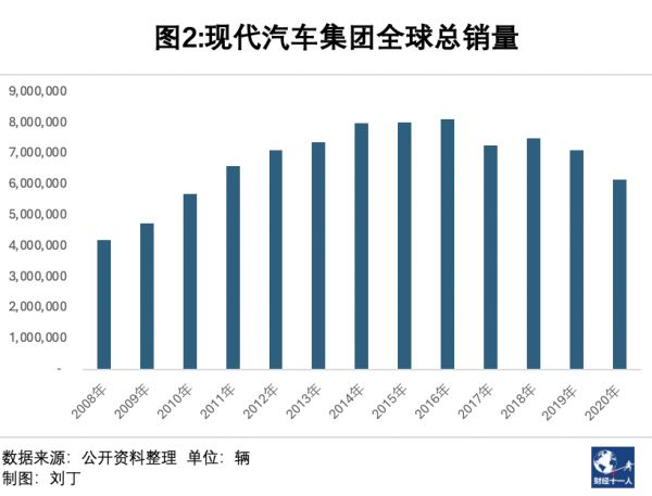 性价比更高的车型,稳步提升的质量口碑,时间最长的质保承诺以及特殊时期的销售政策,共同催动现代汽车的全球销量从2008年的346万辆快速增长到2011年的656万辆,2016年,现代汽车的全球销量达到788万辆的峰值,坐稳了全球前五大汽车集团的位子。