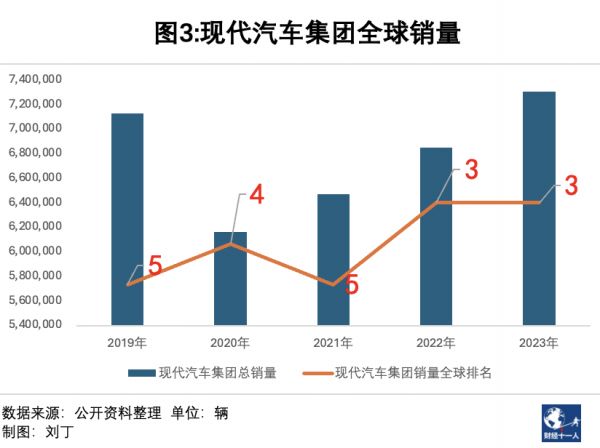 销量方面,疫情后现代汽车的产销恢复在全球化车企中是表现最好的,2023年,总销量已经超过了2019年的水平,达到730万辆,虽然还没达到788万辆的历史峰值,但全球排名却从第五名攀升到第三名。