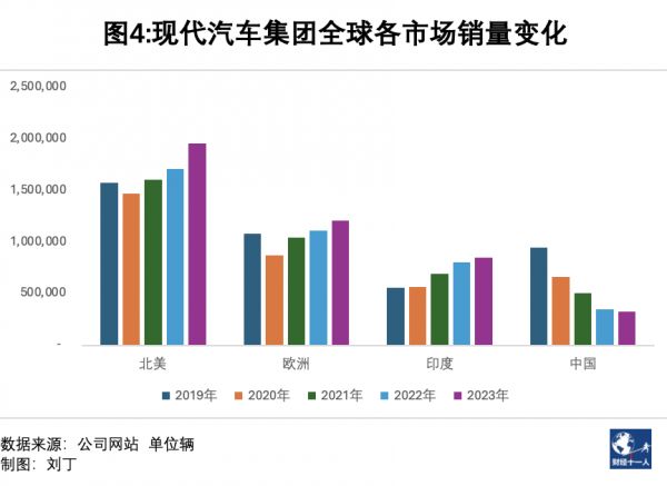 2019到2023年,现代汽车集团在中国失去了约60万辆的销量,弥补这个缺口的是美国、印度、欧洲,三个市场分别增加了约40万辆、30万辆和20万辆。